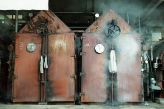 生地を巻き取ったら、蒸し屋に生地を運び「蒸し」の工程に入ります。箱蒸しといって大きな蒸し箱に生地を入れて酸化させ、藍の色を定着させます。80℃の蒸気の中で蒸しを行います。