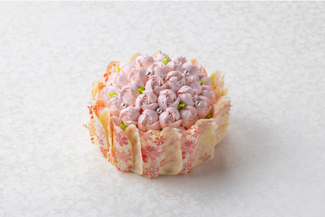 ピスタチオのスポンジ、細かく刻んだピスタチオ、バタークリームをいくえにも重ねた土台を、一輪ずつ丁寧に絞ったピンク色が華やかなバタークリームの花でデコレーションしました。ピスタチオのキャラメリゼのサクサクとした食感と、キャラメルの香ばしさがバタークリームと相まって食べ飽きない一品です。外側には、ホワイトチョコに花柄プリントを施した羽根チョコレートをデコレーションし、まるでブーケのような可愛らしいケーキはプレゼントに最適です。