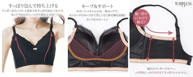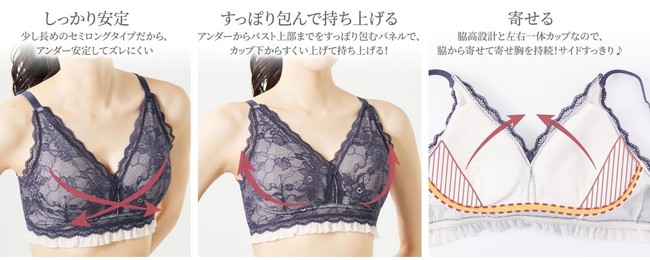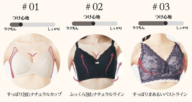 そこで、着用感を、「ラクちん」から「しっかり」まで6段階に設定し、“ワイヤー入りブラジャーのようなしっかりした着用感”や、“すっぽりと胸を包み込むような安定した着用感”など、お客様が求める着用感で商品を選べるような商品を開発。