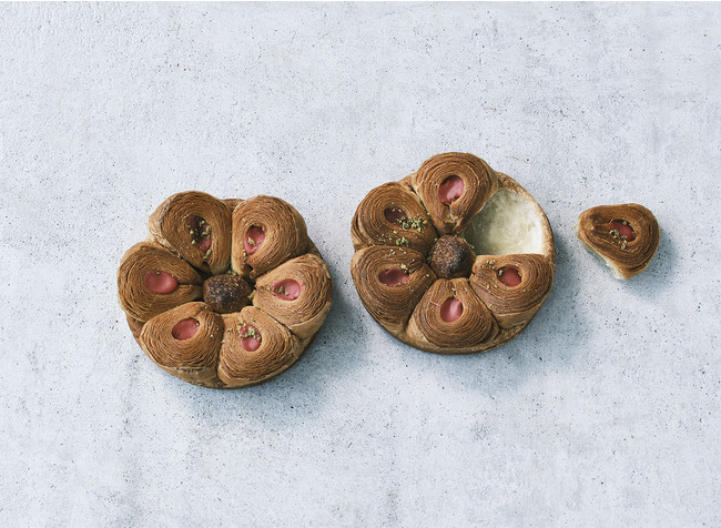 RITUELのシグネチャー「エスカルゴ」をアレンジした「クロワッサン フルール」は、咲き誇る花を思わせる本コラボレーションを象徴するアイコニックな一品。美しく重なる生地の層を花びらに見立てました。フランス産バター香る生地とフランボワーズクリームの甘酸っぱい風味のマリアージュをお楽しみください。