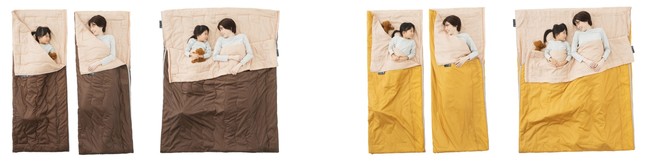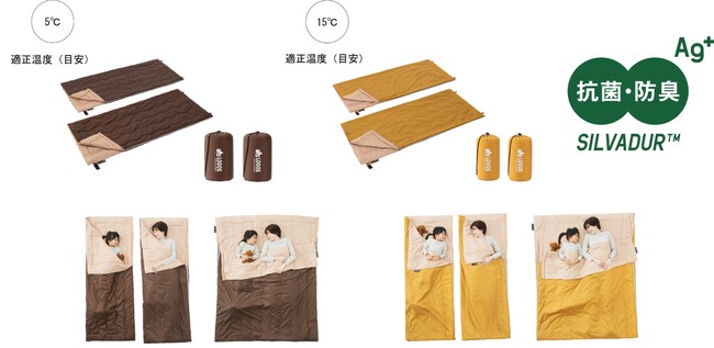 DuPont社の抗菌処理技術「SILVADUR」採用の機能性に優れたシュラフが2個セットになって、連結すれば親子での添い寝に最適な「抗菌防臭 丸洗い2in1寝袋」シリーズ2種を、アウトドアライフでぜひともご活用ください。