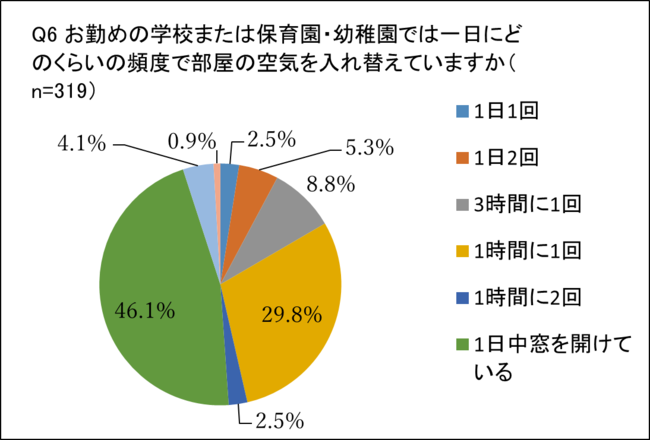 「お勤めの学校または保育園・幼稚園では一日にどのくらいの頻度で部屋の空気を入れ替えていますか」と質問したところ、1時間に2回未満という回答が46.4%と約半数となりました。