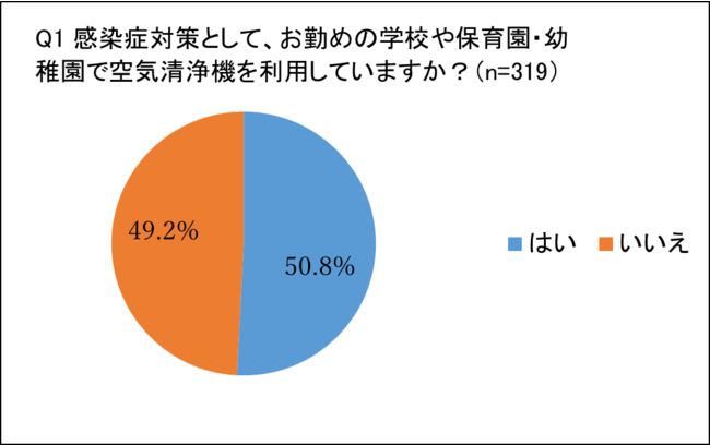 「感染症対策として、お勤めの学校や保育園・幼稚園で空気清浄機を利用していますか」と質問したところ、「利用している」と答えた方が50.8%となり、半数以上の方が空気清浄機を利用されていることがわかりました。また、「コロナ禍以降でお勤めの学校や保育園・幼稚園で空気清浄機の購入(追加も含む)はありましたか。」という質問では、「購入した」との回答が71.0%と7割以上の結果となりました。