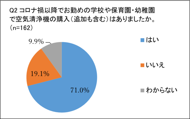 コロナ禍以降、学校や保育園・幼稚園で空気清浄機を購入した施設は7割以上