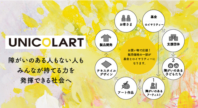 UNICOLART(ユニカラート)とは、unique・color・artを合わせた言葉。チャレンジド(障害のある)のアーティストが描く作品にアレンジを加えて、オリジナルのテキスタイルや雑貨をつくるプロジェクトです。自由な感性にあふれた作品は、見ているだけで元気をもらったり、だれかに伝えたくなったり、障がいって何だろう?と考えるきっかけになったりするかもしれません。