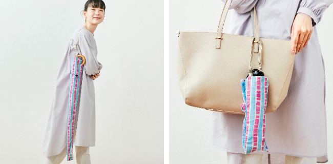 刺しゅうのように見えるストライプ模様がさわやかな印象の傘ケースです。サイズを調節すれば、長傘と折りたたみ傘のどちらにも使えます。ストラップの調節で肩に掛けたりバッグに付けたりできるので、持ち歩きに便利です。