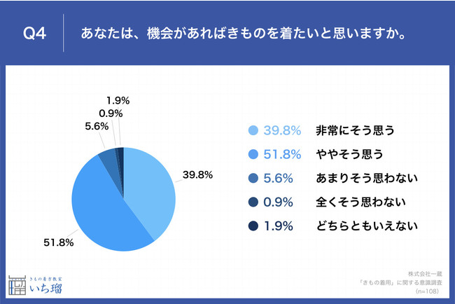 「Q4.あなたは、機会があればきものを着たいと思いますか。」(n=108)と質問したところ、「非常にそう思う」が39.8%、「ややそう思う」が51.8%という回答となりました。