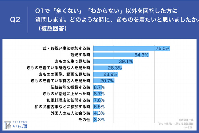 Q1で「全くない」「わからない」以外を回答した方に、「Q2.どのような時に、きものを着たいと思いましたか。(複数回答)」(n=92)と質問したところ、「式・お祝い事に参加する時」が75.0%、「観光する時」が54.3%、「きものを生で見た時」が39.1%という回答となりました。