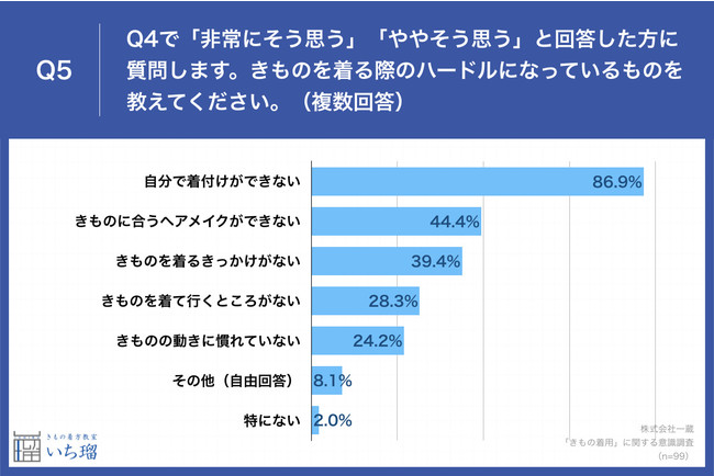 Q4で「非常にそう思う」「ややそう思う」と回答した方に、「Q5.きものを着る際のハードルになっているものを教えてください。(複数回答)」(n=99)と質問したところ、「自分で着付けができない」が86.9%、「きものに合うヘアメイクができない」が44.4%、「きものを着るきっかけがない」が39.4%という回答となりました。