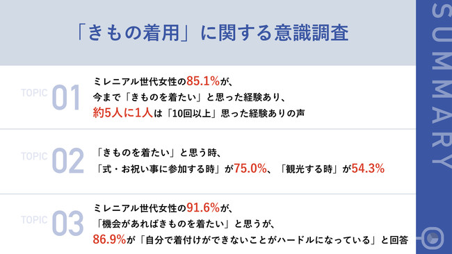 また、きものを持っていない女性の91.6%が、「機会があればきものを着たい」と回答している一方で、86.9%が「自分で着付けができない」ことがハードルになっていることが明らかになりました。