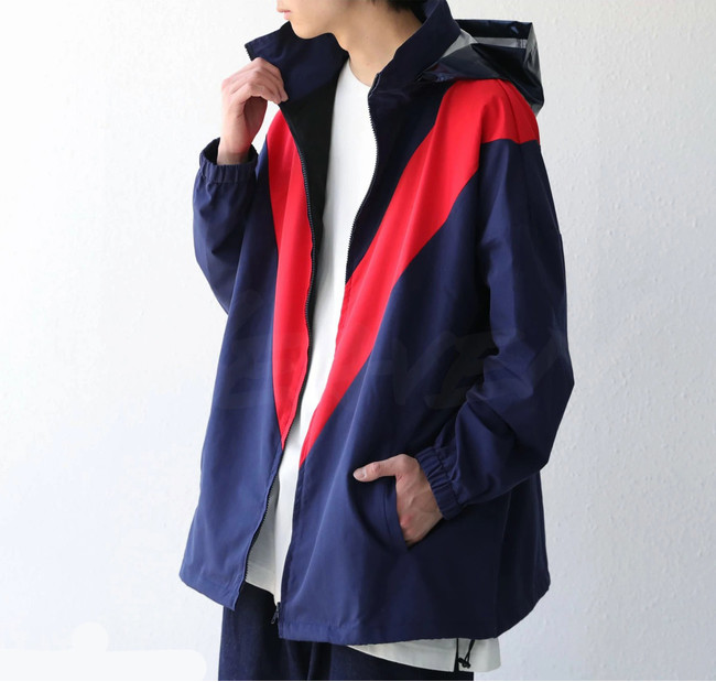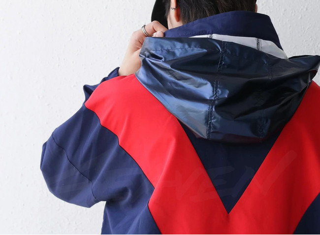襷(たすき)シリーズの進化系として生まれた、V字パネルが特徴的な「IV-JKT(アイビー・ジャケット)」は、NY在住のアーティスト、Nikolas Draper-Iveyとのコラボ。日本のアニメ文化にも造詣が深いShing02(シンゴツー)の大胆なカラリングは、どこか過去の特撮系作品を思い起こさせます。