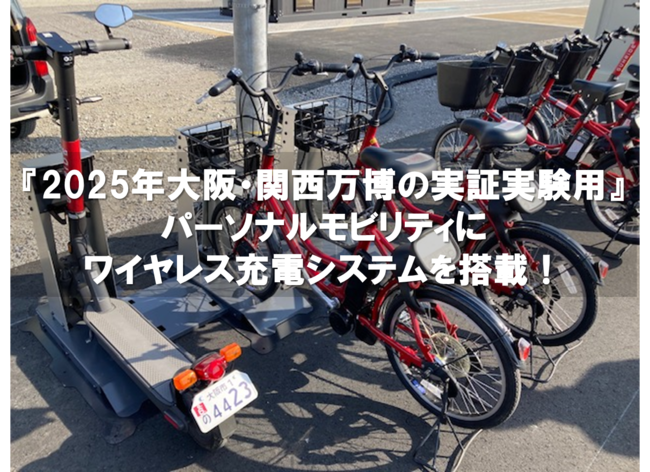 万博開催の機運醸成と未来社会を見据えたイノベーション創出に向けた「夢洲における実証実験」において、パーソナルモビリティの新たな充電手法として、(株)ビー・アンド・プラス製のワイヤレス充電システムが塔載されました。今回は電動自転車とキックボードの2つの車両を共用で充電できるハイブリットスタンドを設置しています。