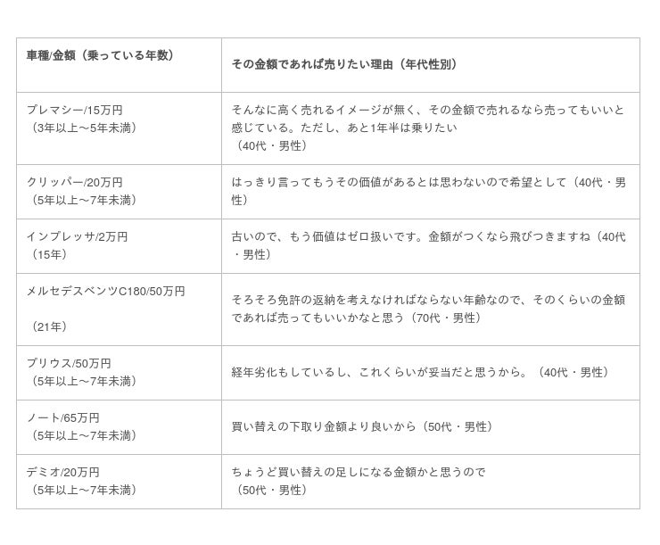 最後に、もし今所有している車を売却するとしたら、いくらぐらいの買取価格であれば売りたいと思うかについて、車種や金額、理由も合わせて聞きました。