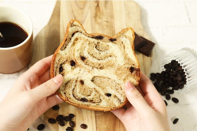また、コーヒー生地に使用した「AMAZING BLEND」は、全体流通量の上位数%を占めるスペシャルティーコーヒーに分類されたコーヒー豆。チョコチップのカカオ感やミルキーな味わいの生地とともに、コーヒーのビター感もご堪能いただけるねこねこ食パンです。