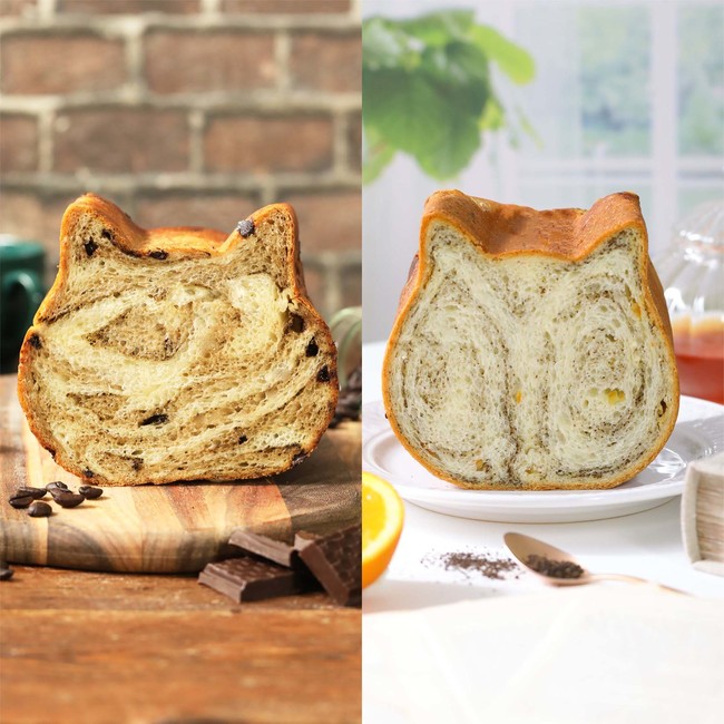 ホワイトチョコが入ったアールグレイ生地と、オレンジピールが入ったプレーン生地を使用し、2種類の味わいをお楽しみいただけるねこねこ食パンに仕上げました。