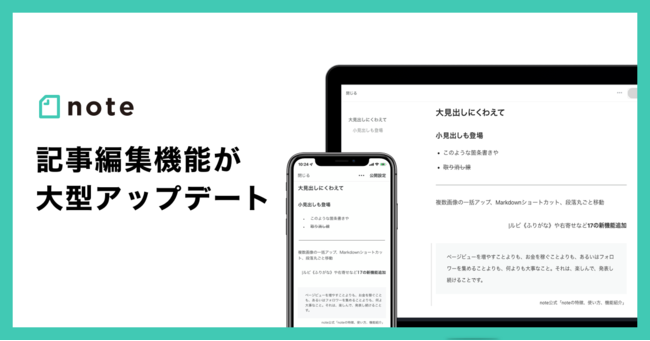 メディアプラットフォームnoteは、4月12日に記事編集機能を大型アップデートしたことをお知らせします。表現力や操作性が向上した、幅広い用途で使えるドキュメントツールです。