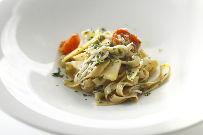 東京都調布市にある深大寺周辺に伝わる「深大寺そば」のそば粉を使った生パスタに、筍やしらす、木の芽といった春の味覚を合わせたオイルベースのパスタ。