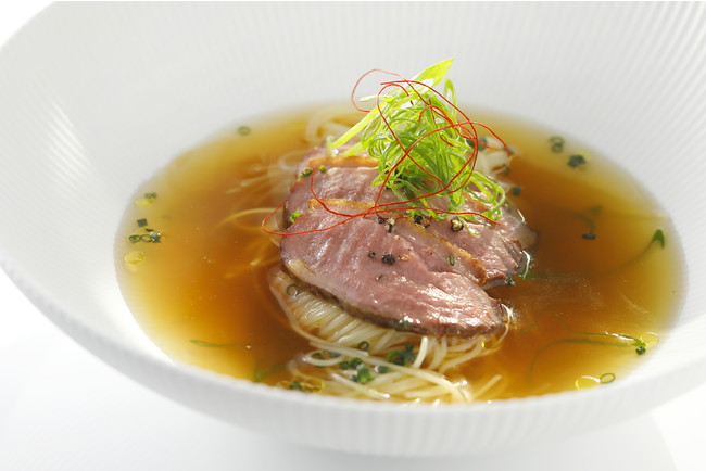 独特のコクと優雅な香り持つ東京生まれの「キッコーゴ醤油」で仕上げた特製のスープに鴨肉、東京ねぎ、細麺のカッペリーニを合わせたスープパスタ。