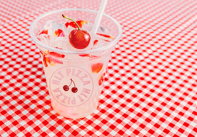Her lip toのシグネチャーであるチェリー柄をモチーフに、チェリーに見立てたマルゲリータベースのピッツァセットや、単品でもご注文いただけるオリジナルドリンク、オリジナルソフトクリームが登場