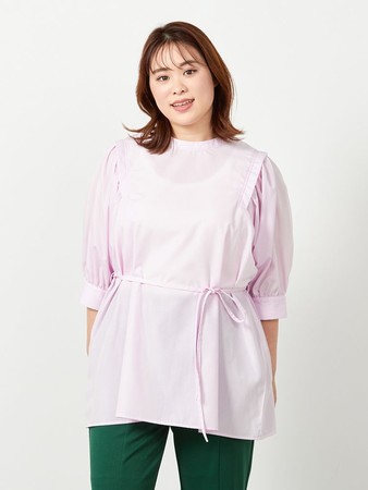 肩の切り替えと、ウエストのリボンがポイントで、1枚でスタイリングがおしゃれにきまるアイテムです。さらに、ボリュームスリーブで腕回りがゆったりして動きやすくなっている為、お仕事にも、普段着にもおすすめの1枚です。