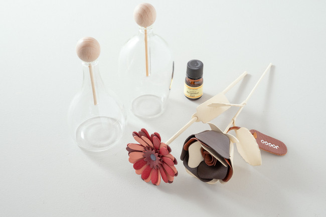 セットで販売するHARIOのアロマディフューザーは、革の一輪花を挿し、花瓶のようにお使いいただくことができます。セットに含まれているアロマオイルも一輪花を挿したまま一緒にお使いいただくことができるため、まるで本物の花のように香りをお楽しみいただけます。