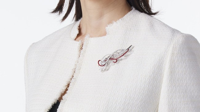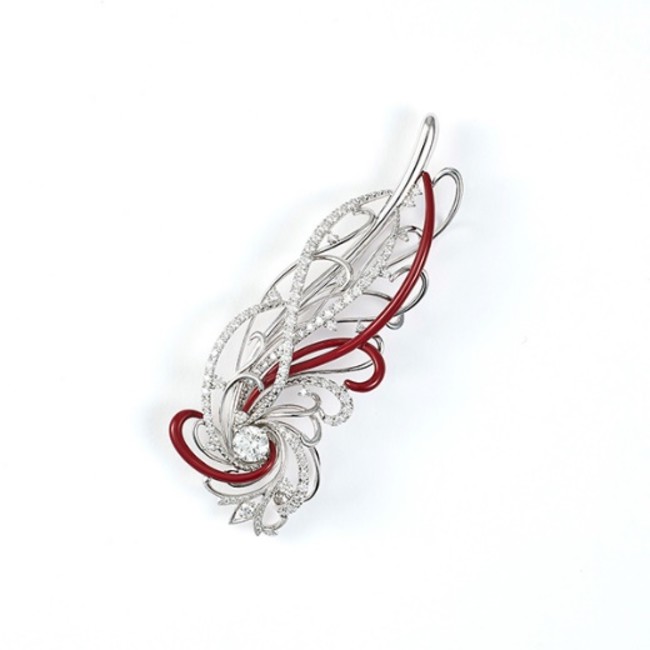 勝利の女神「ニケ」にある強く美しい翼です。力強く天に向かって伸びるラインと繊細なダイアモンドの輝き、太陽の色「赤」は生命力や精神力を表現。この大胆かつ、優雅な翼は現代女性の更なる飛躍と輝きへの想いが込められています。鮮やかな赤のラインは「会津塗り」の漆で、傷つきにくく耐久性に優れた「UV漆」です。翼から覗く“からくさ”はデザインしていく上で大切にしている生命力と繁栄への想い。