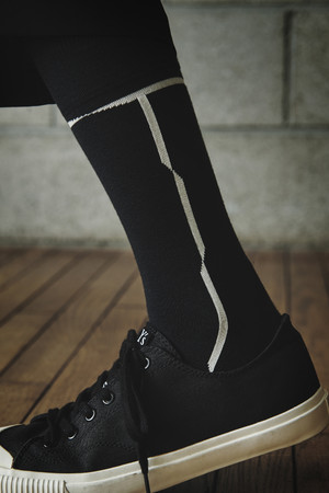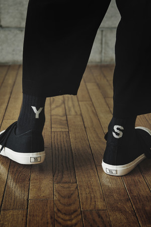 シックストックス定番の「ライン」をねじった様な表現を採り入れたハイゲージソックス、かかとに「Y」と「S」のイニシャルが配されたリブソックスの2シリーズを展開。