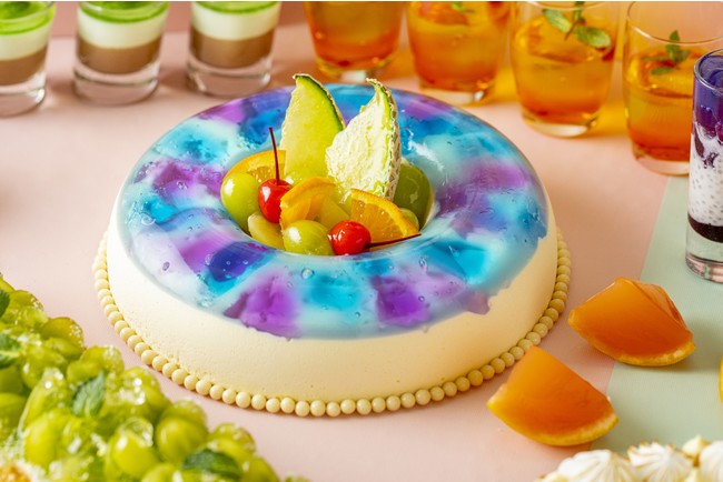 バタフライピーゼリーとレモンゼリーでプールの水面を表現。濃厚な甘みのココナッツピューレをふんだんに使ったムースケーキ。