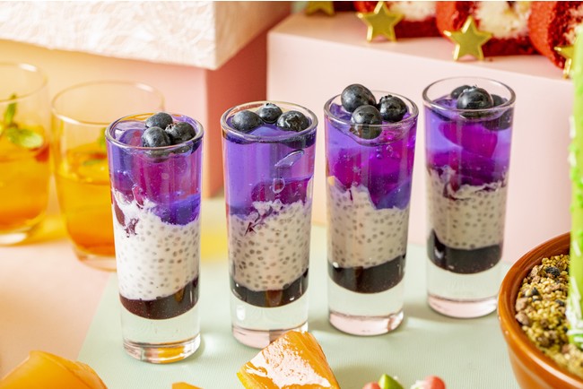 ブルーベリージャム、ミルクココナッツチアシード、ラベンダーゼリー、バタフライピーゼリーで夕暮れ時のビーチをイメージ。
