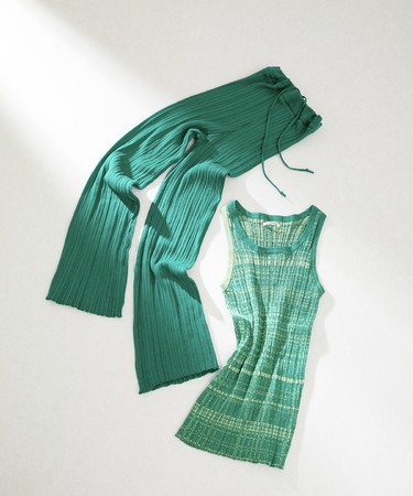 今シーズン WANDERUNG で登場するリブニットシリーズのタンクトップとパンツに、 鮮やかなグリーンカラーを別注させていただきました。