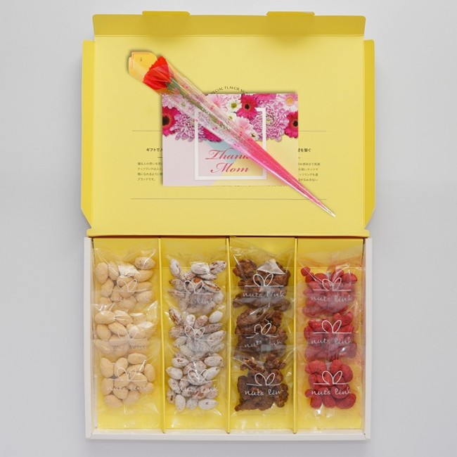 ナッツパティシエが厳選した4種類のフレーバーを各3袋ずつ詰め合わせしたナッツギフト。母の日の贈り物に。メッセージカードとカーネーション(造花)をセットにいたしました。