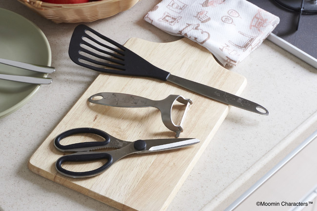 フライパンを傷つけにくく、返しやすい形状のビーターとマルチに使えるキッチンバサミ。そして少し面倒な野菜の皮むきにもムーミンたちが。一段と料理が楽しくなりそうです。