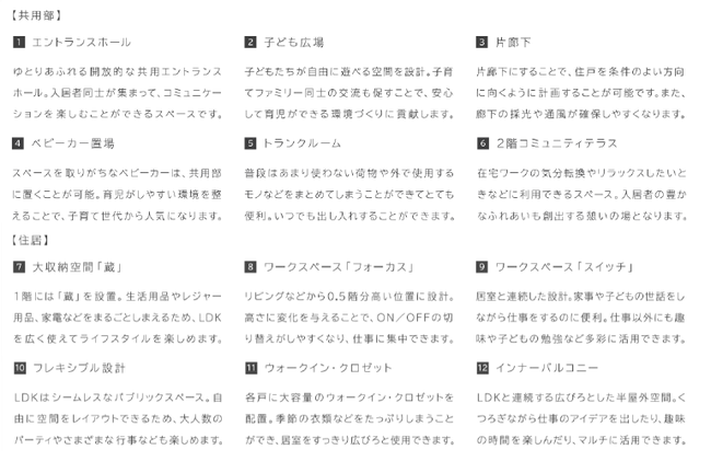 この度発売する「Belle Lead MANSION」は、製造時のCO2排出量が少ない木質建築を採用。また、ミサワホーム独自の高断熱・高気密の木質パネル接着工法に、太陽光発電システムや高効率給湯器などの省エネ設備を組み合わせることにより、ZEH-Mを提案しています。住戸については、ニューノーマルとして定着する在宅ワークに、共働き夫婦を想定した複数箇所のワークスペースを設置。また、大収納空間「蔵」により、災害時の備蓄や多様な暮らしにおいても部屋を有効利用することができます。あわせて、エントランスホールには子ども広場やベビーカー置場を設けて、入居者同士が交流できるようにするなど、共用スペースも充実しています。
