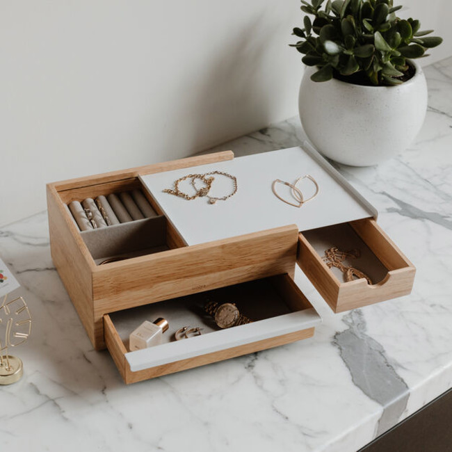 MoMAコレクションに選ばれているブランド、umbra(アンブラ)のゴムノキで作られたジュエリーボックス。さまざまなサイズの引き出しと仕切りで、たくさんのアクセサリーを収納できます。