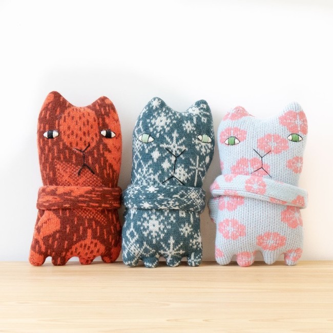 真っ赤に紅葉した森のテキスタイルで作られている「秋のねこ・パンプキン」。そして、冬のキラキラした空気と雪の結晶のテキスタイルで作られている「冬のねこ・スノードロップ」が、ドナの四季シリーズとして発表になっています。もちろんそれぞれに性格もあり、手作りのぬいぐるみたちは制作者がギュッと抱きしめてから皆さまの元に届けられます。ぜひシリーズで揃えてくださいね。第4弾も、お楽しみに!