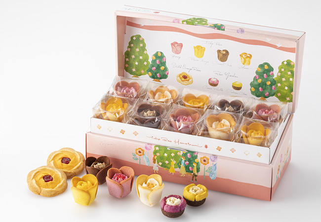 キュートなボックスにお花のスイーツをつめ込んだスペシャルボックスも登場!2段重ねの豪華なボックス「花摘み」はお花が咲きほこった春のチューリップタウンの街角を行き交う人々を描いた限定デザイン。こうばしい香りあふれる期間限定「チューリップローズ チーズ」をはじめ、7種のお花が楽しめる詰合せです。