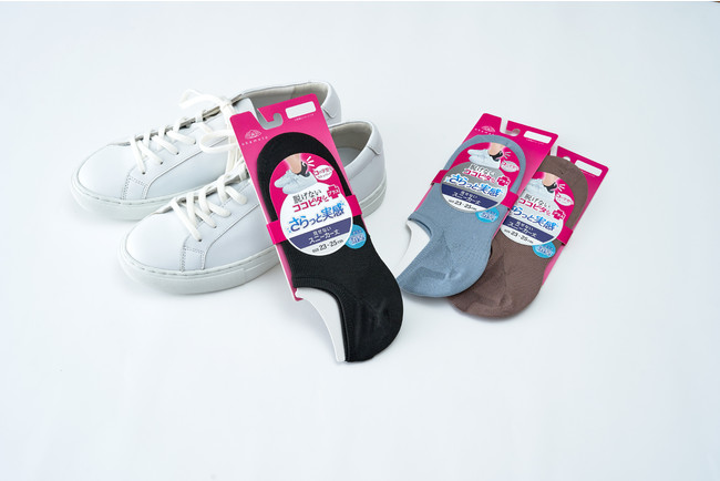 『脱げないココピタプラス さらっと実感』は吸水速乾機能を備えた糸と消臭糸を使い、さらに指の付け根部分と足裏部分にメッシュ組織を入れ従来品の2倍の通気性を実現させた「さらっとメッシュ構造」で汗ムレを軽減するため、1日中さらっとした肌触りで快適に着用いただけます。パンプスやフラットシューズに合わせやすい「浅履き」タイプや「やや深履き」タイプ、スニーカー専用の「見せないスニーカー丈」タイプ。また、黒・グレー・ネイビーなどベーシックカラーの他、この春からは爽やかなサックスやシェードブラウンなどの新色も登場するなど、ファッションや気分に合わせてお選びいただける豊富なバリエーション展開です。