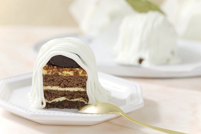 チェリーブランデーを染み込ませたココアポンジとカスタードホイップクリームを交互に重ね、真っ白なホイップクリームで仕上げた「ブラン」。