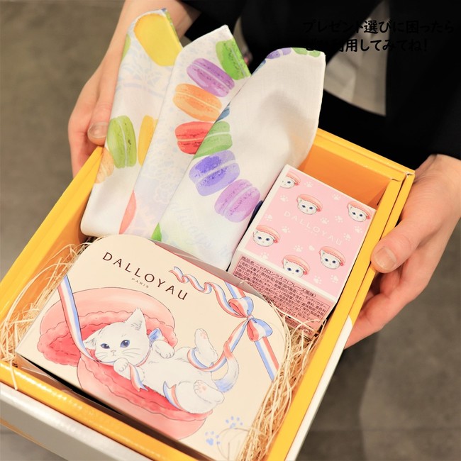 <ダロワイヨ>ニャカロンラスク 3枚入 324円、ニャカロン詰め合わせ 5個入 1,080円<クラシクス・ザ・スモールラグジュアリ>ハンカチーフ(マカロン)2,200円※コーディネート料 550円