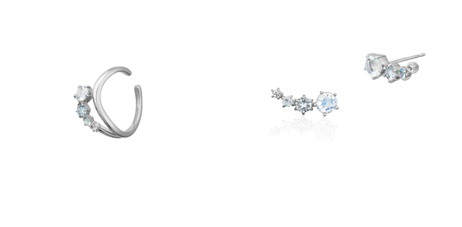 美しいブルーのグラデーションでフェルスパーやシンセティックウォーターオパールをセッティングしたイヤージュエリーは、光の角度によって一粒一粒が表情を変えます。夏めく眩い光をまとった爽やかな色合いのカラーストーンを身に着けて、あなたの新たな魅力を引き出して。