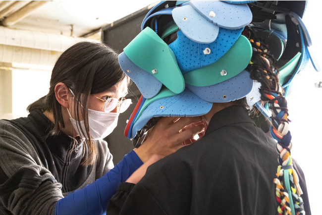 「Earth Day」にちなみ“地球”をテーマとした今回のコレクションを表現するためのアートを、クリエイターの鷲見友佑さん、パラリンアートアーティストのはたあつきさん、ニューバランスアンバサダーの山本まさみさんとのコラボレーションで制作しました。シューズのインソールや、アパレル、バッグなど、本来なら廃棄されてしまう使用済のサンプルを用い、クリエイターの鷲見さんとパラリンアーティストのはたあつきさんがワークショップを実施。アパレルどうしを結び、身に着けて、新たな形を生み出しました。ワークショップを経て、鷲見さんはインソールやバッグを活用したヘッドピースとハンドピースを製作。キービジュアル作成に向け、イメージをふくらませ、役目を終えたサンプルに新しい命を吹き込みました。そして、キービジュアル撮影には、ニューバランスアンバサダーの山本まさみさんをモデルに迎えます。ワークショップで得た「結ぶ」という手法から9つの「9BOX」Tシャツを結びひとつの衣装として山本さんが着用。そして、カラフルなサンプルから再生した新たな装いを身につけ、生命を花に見立てて表現しました。