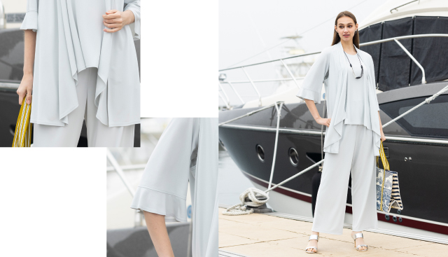 ジョイクールはドレープやフレアが綺麗に決まるしなやかさが魅力です。素材の良さを活かした女性らしいセットアップが登場。クールなグレーでまとめたワントーンコーデが大人の余裕を感じさせるスタイリング。