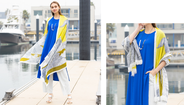 今年らしいレイヤードスタイルがおすすめのドレス。左サイドに深く入ったスリットがポイント。同素材のワイドパンツと合わせて、リラクシーでありながらエレガントに。インポートのストールをアクセント、色を効かせた上品スタイル。