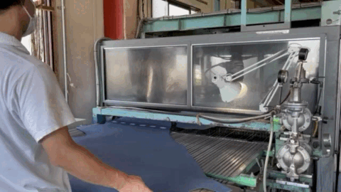 皮革染色では自動スプレー、手拭きスプレー、最後に手作業で色の微調整を行い理想の色風合いに仕上げていきます。