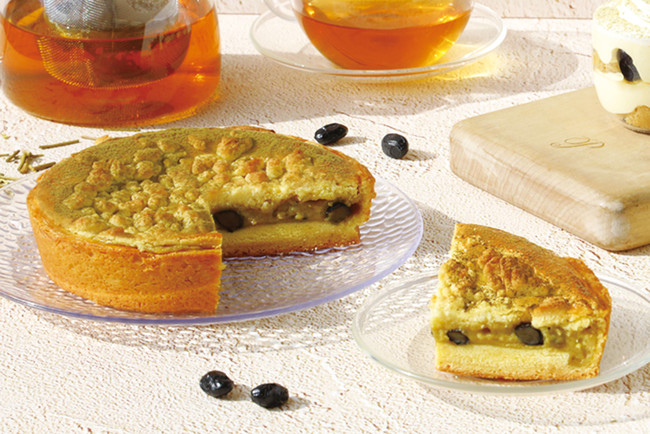 中にはもちっとした食感の黒豆が入っており、和テイストなガトーバスクに仕上げています。こんがりと焼き上げることでガレット生地がサクサクになり、噛む度にバターがじゅわっと染み出て食欲をそそります。