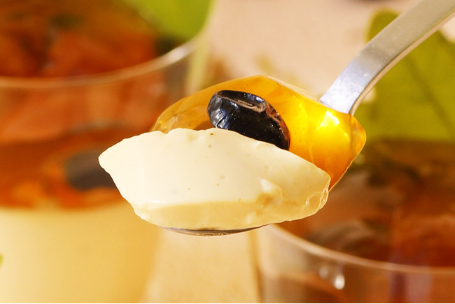 ゼリーの中に入れた黒豆の甘みをご賞味いただきながら、柔らかにとろけていく献上加賀棒茶のパンナコッタをご賞味いただけます。