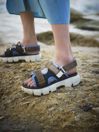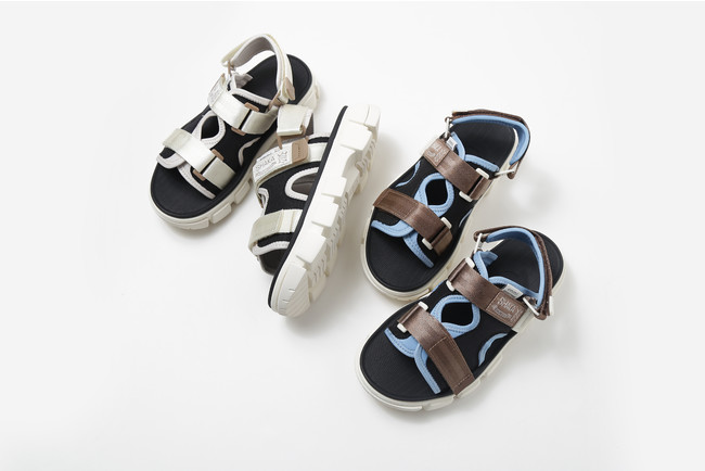 アイスブルーのパイピングを施したブラックに都会的なブラウンを掛け合わせた大人な印象のサンダルが登場