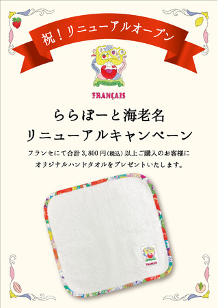 オープンを記念して、オリジナルハンドタオルが貰える『ららぽーと海老名リニューアルキャンペーン』を実施致します!是非この機会をお見逃しなく!