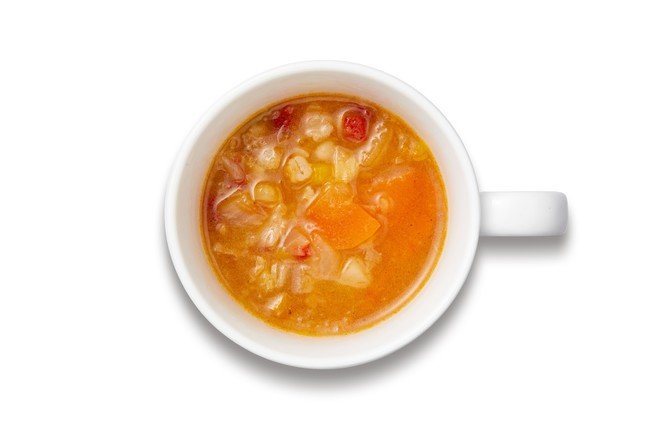 押し麦とショウガの入った野菜たっぷりのスープ。