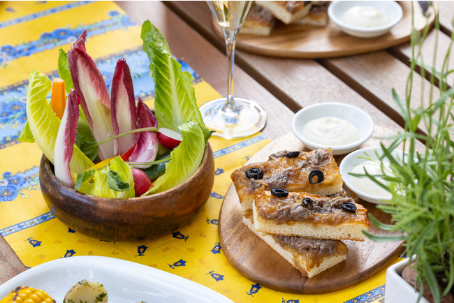伝統的なビストロ料理をスタイリッシュにアレンジしたオールデイ ダイニング「フレンチ キッチン」では、夏の心地よい夜風を感じながらまるで南フランスのリゾートで過ごすバカンス気分をお楽しみいただけるテラスプランが登場いたします。前菜には、プロヴァンス地方の郷土料理で、キャラメリゼした玉ねぎにアンチョビやオリーブを加えてつくるピザのような見た目のピサラディエールをご提供いたします。玉ねぎの甘みにアンチョビやオリーブの塩味が合わさり、シャンパンやワインともマッチする、思わずお酒が進む一品です。メインでは、ビーフをタイムやローズマリー、マジョラムなどのハーブでマリネしてから香り高く焼き上げるブロシェット(串焼き)や、ラベンダーでマリネした真鯛を天ぷらのように揚げる料理“ベニエ”など、プロヴァンス地方の料理の数々がそろいます。シャンパンを含むワインやカクテルをお好きなだけお楽しみいただけるプランをはじめ、お食事だけのプランなどお好みや用途に合わせてお選びいただける3つのプランをご用意いたしました。テラスの幻想的なイルミネーションや照明に加え、このプランをご注文いただいたゲストだけがご利用いただけるバーカウンターも登場し、南仏のリゾート地で行われるソワレ(夜会)のようなひとときをお過ごしいただけます。